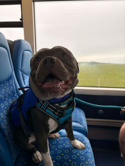 Blue is very excited to see every dog he sees on his walks and can be a bit boisterous and typical bully breed when it comes to meeting new friends, but he is good when he meets a dog with the equal energy and can then have a good interaction.