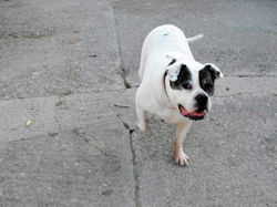 Nala (white with markings both sides of her face) is a friendly girl but is looking for a home where the children are of older teenage years. Nala is good with other dogs but not used to cats. Nala walks well on and off the lead and can be left without any problems and travels well. Overall, Nala is very good natured, gentle and un-energetic and loves to be cuddled and enjoys sitting on a knee as she thinks she is a lapdog!