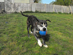 Nico (brown brindle) was ran over as a puppy so has a slightly bent paw, but this does not affect his mobility. Nico is a friendly boy and good with both adults and children, but is looking for a home where the children are of older teenage years. Nico walks well on and off the lead and is good with other dogs but not used to cats. Nico can be left without any problems and travels well. Overall, Nico is more playful and absolutely loves his toy and likes to have it thrown straight towards him so he can catch it. Nico is also friendly, but more interested in play than in fusses.